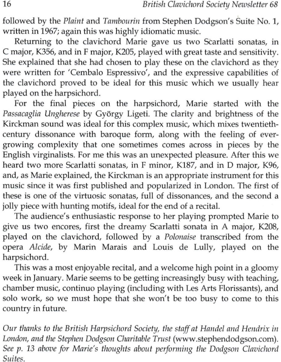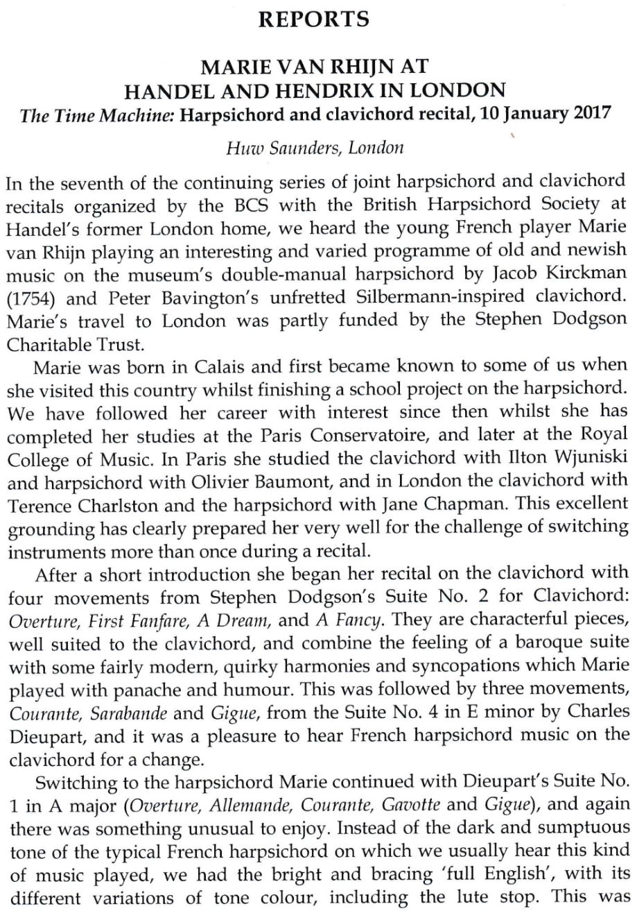 Critique du récital Time Machine, British Harpsichord and British Clavichord Society, Janvier 2017, Londres.