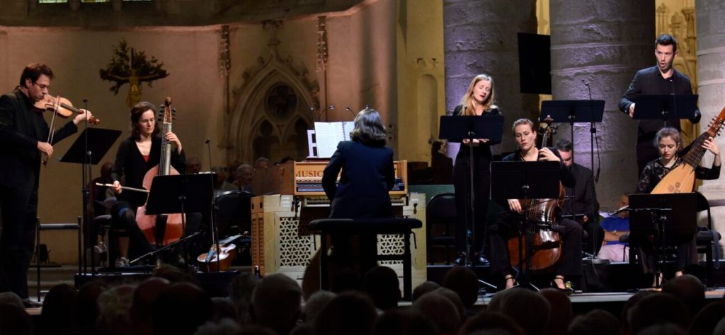 C’est aujourd’hui le baptême – musical – de L’Assemblée, nouvelle formation dans le monde du baroque, à l’initiative de Marie Van Rhijn*, déjà reconnue comme claveciniste. Elle a réuni autour de ses deux instruments (car elle tient avec un égal brio le positif) quatre de ses amis musiciens dont la carrière est également amorcée avec succès : Josef Zak, violon ; Myriam Rignol, dessus et basse de viole bien connue ; Alice Coquart, remarquable basse de violon ; et Léa Masson, dont on découvre sa maîtrise du théorbe. On le sait, point ne suffit de réunir des instrumentistes, quelles qu’en soient les qualités individuelles, pour réaliser un ensemble. Or, sa cheffe écoute, dirige, chante et fait chanter chacun, équilibre, sculpte les phrasés, avec des articulations et une précision millimétrée des attaques qui laisseraient imaginer que l’ensemble travaille depuis une bonne décennie à parfaire son jeu. On pouvait redouter que la douzaine de pièces vocales para-liturgiques engendre la lassitude, sinon l’ennui. Avec deux pages instrumentales de belle facture, les motets programmés renouvellent les modes d’expression, les couleurs et les effectifs, de sorte qu’à aucun moment l’attention ne faiblit.